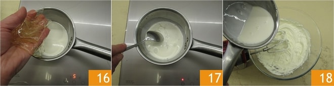 Calienta otros 100 g de nata en un cazo 16. Luego escurre la gelatina, viértela en la nata caliente y mezcla hasta que esté disuelta 18. Deja templar un momento y viértela en la mezcla de queso 19.