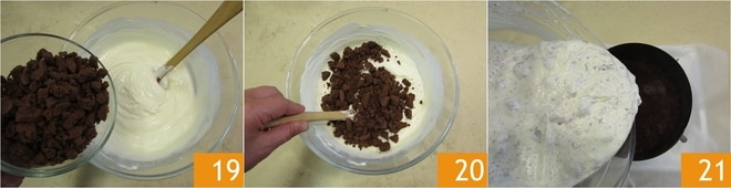 Mezcla nuevamente y cuando esté bien absorbida añade las galletas previamente desmenuzadas a mano 19. Mezcla de nuevo 20, luego transfiere la mezcla dentro del molde con la base de galletas de cacao 21. Nivela bien la superficie y transfiere al frigorífico durante al menos 4 horas.