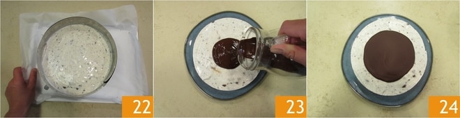 Pasado este tiempo, derrite los 100 g de chocolate que servirán para la decoración final. Desmolda la tarta 22, quita el papel acetato y colócala en un plato para servir. Vierte el chocolate en el centro de la tarta, de forma que se forme un disco, sin cubrirla completamente 23. Transfiere nuevamente al frigorífico, hasta que el chocolate se haya solidificado. Luego podrás servirla 24.
