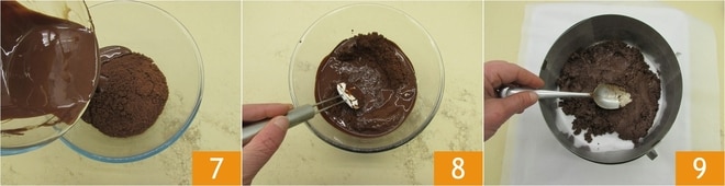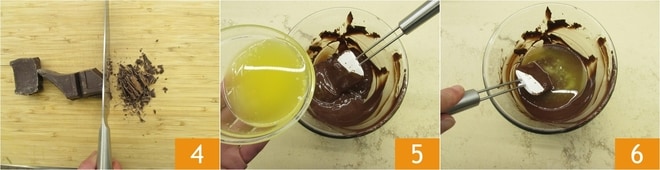 Pica finamente el chocolate 4 y derrítelo al baño maría o en microondas. Derrite también la mantequilla y viértela en el chocolate derretido 5. Mezcla bien con una espátula para homogeneizar 6.