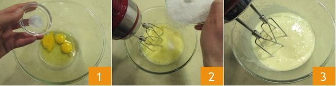 Para realizar la tarta de leche caliente, romped los huevos en un bol, añadid una pizca de sal 1 y encended la batidora. Mientras la batidora está en funcionamiento, añadid gradualmente el azúcar, así facilitaréis su absorción 2. Cuando la mezcla esté clara y espumosa, aproximadamente 10 minutos después, apagad las varillas eléctricas 3.