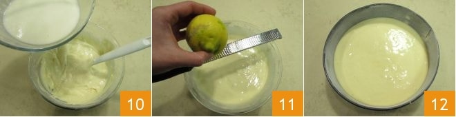 Ahora verted la masa líquida en el recipiente más grande con el resto de la mezcla 10, mezclad delicadamente con una espátula y finalmente rallad la cáscara de limón 11. Engrasad y enharinad un molde de 20 cm de diámetro y llenadlo con la masa obtenida 12.