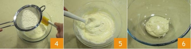 Colocad un colador sobre el bol y tamizad los polvos, es decir, la harina y la levadura, añadiéndolos gradualmente mientras mezcláis con la espátula de abajo hacia arriba 4, para incorporarlos sin desmontar la mezcla 5. En este punto, retirad un par de cucharadas de masa y reservadlas en otro recipiente 6.