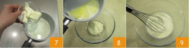 En un cazo, poned a calentar la leche a fuego medio, luego añadid la mantequilla 7: dejad que se derrita completamente y llevad todo hasta casi el hervor. Tan pronto como esté a temperatura, apagad el fuego y verted la mezcla en el recipiente con las cucharadas de masa que habíais reservado anteriormente 8. Mezclad bien con un batidor para obtener una especie de masa líquida 9.