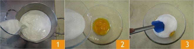 Para preparar la crostata de limones con masa quebrada al aceite, lo primero que hay que hacer es rallar la cáscara de un limón y exprimir su jugo, necesitaréis 50 g. Luego preparad la crema: verted la leche en una cacerola 1, añadid una pizca de sal y llevad a punto de ebullición a fuego bajo. Verted las yemas y el azúcar en un bol 2; mezclad con una espátula 3.