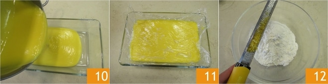 Transferid la mezcla a una fuente 10 y cubridla con film plástico en contacto 11. Dejad enfriar primero a temperatura ambiente, luego en la nevera. Ahora preparad la masa quebrada. En un bol, verted la harina y la cáscara de limón que habíais rallado anteriormente 12.