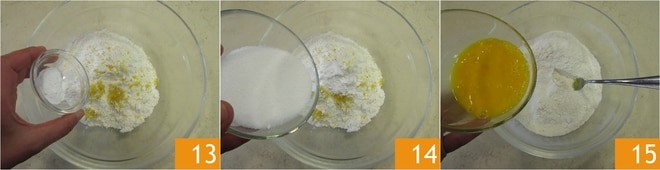 Añadid una pizca de sal, la levadura 13 y el azúcar 14. Mezclad con un tenedor, luego verted los huevos ligeramente batidos 15.