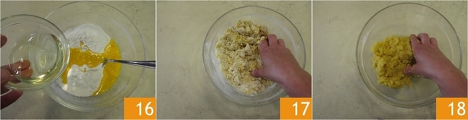 Incorporad también el aceite 16 y amasad con las manos durante poco tiempo 17 hasta tener una masa compacta 18.