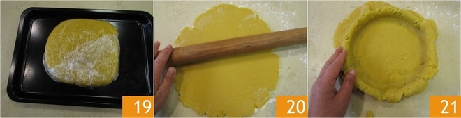 Formad una bola, envolvedla en film plástico 19 y dejadla reposar en la nevera durante unos 30 minutos. Pasado el tiempo de reposo, extendid la masa quebrada con un poco de harina, debéis obtener un grosor de aproximadamente medio cm 20. Colocad la masa en un molde para crostata de 20 cm, haciéndola adherir bien a la base 21.