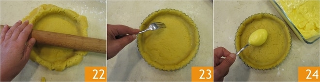 Eliminad el exceso de masa quebrada en los bordes 22 y amasadla de nuevo. Extendédla y colocadla en la nevera. Pinchad la masa quebrada con los dientes de un tenedor 23 y verted la crema de limón en el interior 24.