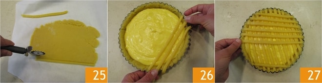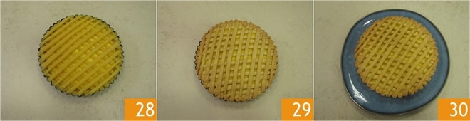 Una vez decorada la crostata 28, cocinad en el horno precalentado a 170° durante unos 45 minutos. Sacad la crostata del horno 29 y dejadla enfriar antes de desmoldarla 30.