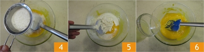 Incorporad la harina tamizada 4 y mezclad de nuevo 5. Por último, añadid el jugo de limón 6 y mezclad delicadamente hasta obtener una mezcla homogénea.