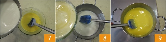 En cuanto la leche empiece a hervir, vertedla en la mezcla de yemas en 2-3 veces, mezclando para temperarla. Verted todo de nuevo en la cacerola 8 y poned al fuego. Llevad a ebullición a fuego lento, mezclando bien con una espátula, asegurándoos de que la crema no se pegue al fondo de la cacerola. Cuando empiece a espesar 9, cocinad durante 1-2 minutos, luego apagáis el fuego.