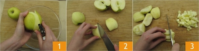 Para preparar la tarta de manzana sin huevos, lo primero que debes hacer es rallar la cáscara del limón y reservarla, luego exprime su jugo para obtener la cantidad indicada (aproximadamente necesitarás medio limón). Ahora pasa a las manzanas: pélalas 2 y córtalas en gajos 2. Elimina el corazón y corta las manzanas en cubos de aproximadamente 1 cm 3. Deberás obtener 375 gramos.