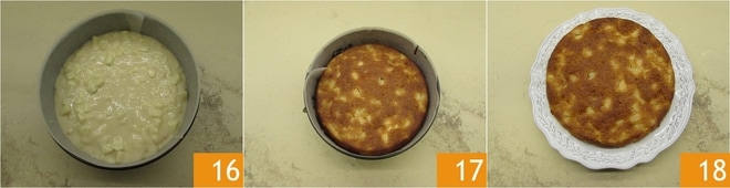 En este punto 16, hornea el dulce en un horno estático precalentado a 180° en la rejilla media-baja durante aproximadamente 45/50 minutos. Verifica la cocción con un palillo, de lo contrario, prolonga el tiempo hasta que esté seco. Saca la tarta de manzana sin huevos 17, déjala enfriar dentro del molde antes de desmoldarla y servirla 18.