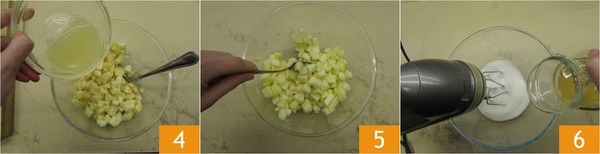 Transfiere los cubos de manzana a un bol, añade el jugo de limón 4 para que no se oscurezcan y mezcla bien 5. Pasa a la masa. En un bol, vierte el azúcar y, con las varillas en funcionamiento a baja velocidad, incorpora lentamente el jugo de manzana en un hilo fino 6.
