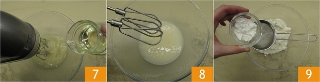 Cuando esté bien incorporado, añade también el aceite 7, siempre vertiéndolo en un hilo fino, con las varillas eléctricas en funcionamiento, para obtener una emulsión estable y brillante 8. En un bol, tamiza la harina y la levadura 9.