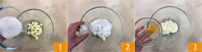 Para preparar la tarta de manzana y caramelo, viertan en un bol la mantequilla, el azúcar 1 y la sal 2, amasen a mano y luego añadan el huevo 3.