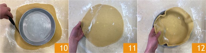 Sobre la masa, coloquen un molde de 22 cm y recorten un disco 10 un poco más grande que el molde para cubrir fondo y borde 11. Inserten la masa quebrada en el molde engrasado 12 y háganla adherir bien 12.