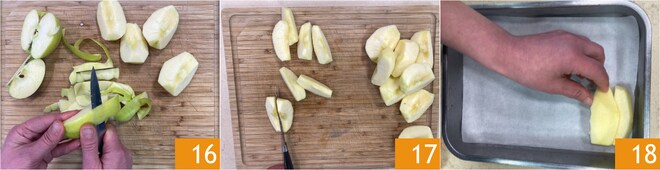 Preparen las manzanas: pélenlas 16 y córtenlas en gajos 17, colóquenlas sobre una fuente con papel de horno 18.