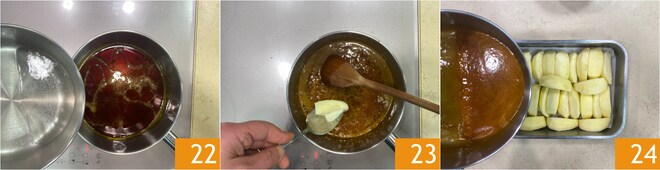 Una vez listo, viertan en dos veces el agua hirviendo 22, remuevan para amalgamar, luego apaguen el fuego e incorporen la mantequilla 23. Vierten el caramelo sobre las manzanas 24.