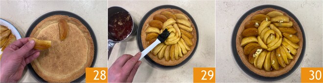 Ahora distribuyan las manzanas sobre la masa quebrada 28 en forma de espiral. Luego calienten el caramelo y úntenlo sobre las manzanas 29. La tarta de manzana y caramelo está lista, pueden embellecerla a su gusto con hojas de oro 30.