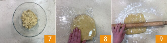 Amasen para obtener una mezcla homogénea y lisa 7, formen un bloque, envuélvanlo en film transparente y pónganlo en el frigorífico durante 1 hora 8. Extiendan la masa quebrada con el rodillo 9 a un grosor de 3 mm.
