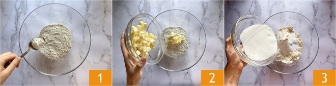 Para realizar la tarta de migas con crema, trabajad en un bol la harina, la levadura para dulces 1, la mantequilla fría en trozos 2, las semillas de una vaina de vainilla y la sal. Mezclad y desmenuzad hasta obtener una consistencia arenosa. Luego añadid el azúcar 3,