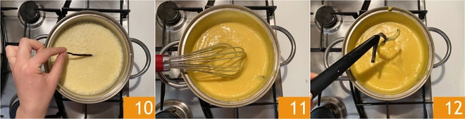 Añadid la vaina de vainilla que sobró de la masa 10 y cocinad la crema a fuego bajo, mezclando con un batidor, durante 6-7 minutos 11. Cuando la crema se haya espesado, apagad el fuego y eliminad la vaina de vainilla 12. Dejad enfriar la crema.
