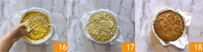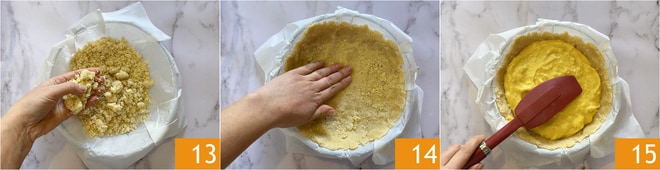 Forrad con papel de horno un molde de 24 cm de diámetro. Verted poco más de la mitad de la masa desmenuzada 13. Distribuidla por el fondo y los bordes. Compactad la masa con las manos 14. Verted la crema preparada, niveladla con una espátula, procurando no superar los bordes de la masa 15.