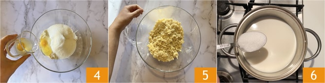 los huevos 4, incorporadlos y desmenuzad nuevamente la masa con los dedos. Cubrid el bol con film transparente 5 y dejad reposar en el frigorífico durante 1 hora. Mientras tanto, preparad la crema pastelera: verted la leche en un cazo, añadid el azúcar 6,