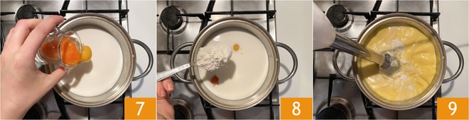 las yemas 7 y la harina 8. Batid los ingredientes con una batidora de mano para que se mezclen bien 9.