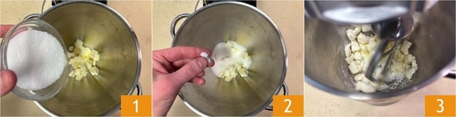 Para preparar la tarta mimosa, empieza por la masa quebrada: en el bol de la batidora con el accesorio de pala, coloca la mantequilla en trozos, sacada de la nevera 5 minutos antes, el azúcar 1 y una pizca de sal 2. Acciona la batidora para mezclar rápidamente 3.