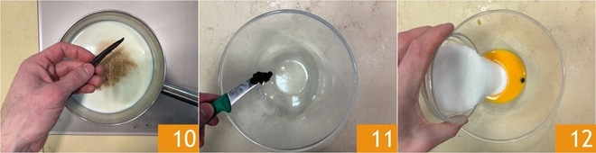 Para preparar la crema pastelera, extrae las semillas de la vaina de vainilla, luego lleva a ebullición la leche con la ralladura de limón, la vaina, una pizca de canela en polvo y una pizca de sal 10. Mientras tanto, en un bol, une las semillas de vainilla 11, las yemas y el azúcar 12.