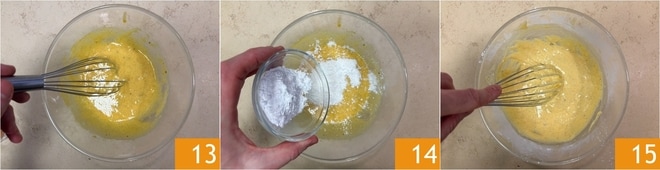 Mezcla con el batidor 13, luego incorpora el almidón de maíz y el almidón de arroz 14 y mezcla bien todo 15.