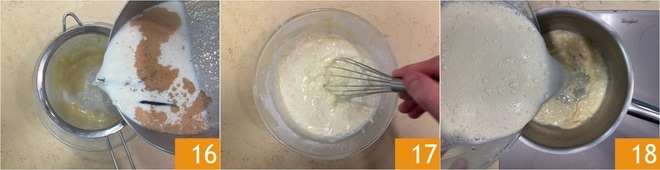 Cuando la leche llegue a ebullición, cuélala directamente en el bol con la mezcla de yemas y azúcar 16 y mezcla con un batidor 17. Transfiere la mezcla a una cacerola de fondo grueso 18.