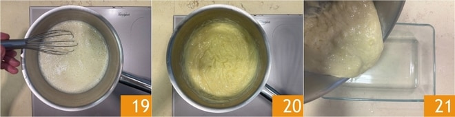 Cocina la crema a fuego medio, removiendo constantemente 19, hasta que espese 20. Vierte la crema en una fuente 21, cubre con film en contacto y deja enfriar a temperatura ambiente por 30 minutos. Luego transfiérela a una manga pastelera sin boquilla y colócala en el frigorífico por al menos 3 horas.