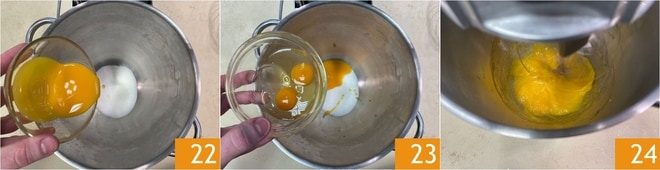 Para preparar el bizcocho, coloca en la batidora, equipada con varillas eléctricas, el azúcar, las yemas 22, los huevos enteros 23 y una pizca de sal. Bate con las varillas por al menos 10 minutos 24.