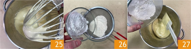 Debes obtener una mezcla clara y espumosa 25. En un bol aparte, tamiza la harina y la maicena un par de veces 26, luego incorpora las harinas poco a poco a la mezcla batida, mezclando delicadamente con una espátula de abajo hacia arriba para no desinflarla 27.