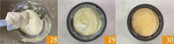 La masa está lista 28. Forra con papel de horno un molde de 25 cm de diámetro y vierte la mezcla en su interior 29. Hornea en horno estático precalentado a 175-180°C por unos 18 minutos. Haz la prueba de cocción con un palillo: si sale seco, el bizcocho está listo. Desmóldalo 30 y deja enfriar a temperatura ambiente.