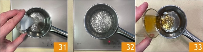 Para preparar el almíbar, vierte en una cacerola el agua y el azúcar 31, luego lleva a ebullición 32. Retira del fuego y deja enfriar completamente. Una vez que el jarabe esté frío, añade el ron 33 y mezcla.