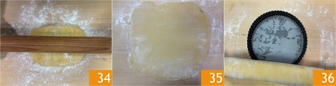 Después de que la masa quebrada haya reposado en el frigorífico, estírala con el rodillo sobre una superficie de trabajo enharinada 34 hasta alcanzar un grosor de unos 5 mm 35. Engrasa y enharina un molde de 25 cm de diámetro, de al menos 3,5 cm de alto, y fórralo con la masa quebrada, envolviéndola primero en el rodillo y luego desenrollándola sobre el molde 36.