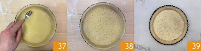 Haz que la masa quebrada se adhiera al fondo y a los bordes, luego recorta el exceso de masa y perfora el fondo con un tenedor 37. Hornea en horno estático precalentado a 175°C por unos 30 minutos 38. Una vez cocida, deja enfriar completamente la base 39.