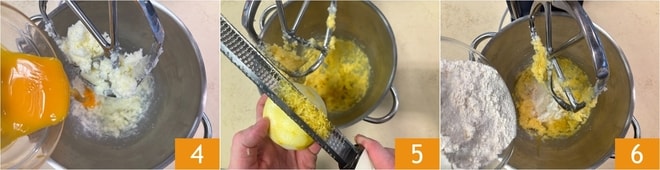 Añade las yemas 4 y la ralladura de limón 5, mezcla bien, luego incorpora la harina 6 y continúa amasando.