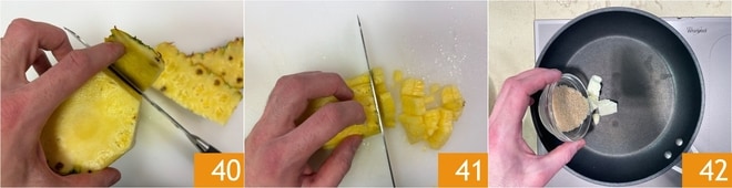 Limpia la piña y obtén 200 g de pulpa 40, luego córtala en pequeños cubos 41. En una sartén, derrite la mantequilla y el azúcar moreno 42.