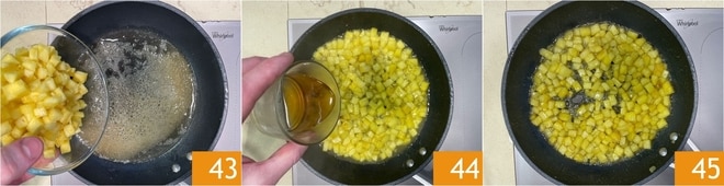 Añade la piña 43, rocía con el ron 44 y cocina a fuego lento hasta que esté ligeramente caramelizada 45.