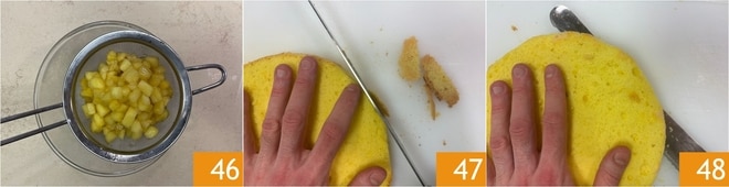 Escurre los cubitos de piña y déjalos enfriar completamente 46. Mientras tanto, con un cuchillo de sierra, elimina la corteza exterior del bizcocho 47. Divide el bizcocho horizontalmente por la mitad para obtener un disco de 1 cm de grosor 48.