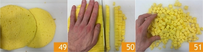 Obtendrás así 2 discos 49. Corta un disco en cubitos de aproximadamente 1 cm 50, así crearás las flores de mimosa 51.