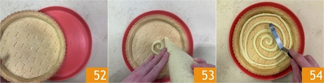 Coloca la base de masa quebrada enfriada en una bandeja de servir 52, luego distribuye la mitad de la crema pastelera en el fondo 53 extendiéndola con la espátula 54.