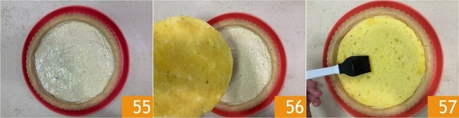 Debes obtener una capa homogénea 55. Pincela con el almíbar un lado del segundo disco de bizcocho, de 1 cm de grosor, colócalo sobre la crema, con el lado humedecido hacia abajo 56, luego pincélalo con el almíbar de ron también por el otro lado 57.